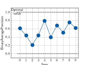 >>> # Example plotting multiple values >>> import torch >>> from torchmetrics.classification import BinaryAveragePrecision >>> metric = BinaryAveragePrecision() >>> values = [ ] >>> for _ in range(10): ... values.append(metric(torch.rand(20,), torch.randint(2, (20,)))) >>> fig_, ax_ = metric.plot(values)