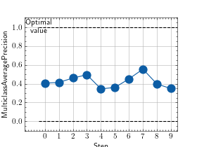 >>> # Example plotting multiple values >>> import torch >>> from torchmetrics.classification import MulticlassAveragePrecision >>> metric = MulticlassAveragePrecision(num_classes=3) >>> values = [ ] >>> for _ in range(10): ... values.append(metric(torch.randn(20, 3), torch.randint(3, (20,)))) >>> fig_, ax_ = metric.plot(values)