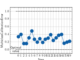 >>> from torch import randn, randint >>> # Example plotting a multiple values >>> from torchmetrics.classification import MulticlassCalibrationError >>> metric = MulticlassCalibrationError(num_classes=3, n_bins=3, norm='l1') >>> values = [] >>> for _ in range(20): ... values.append(metric(randn(20,3).softmax(dim=-1), randint(3, (20,)))) >>> fig_, ax_ = metric.plot(values)