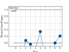>>> from torch import rand, randint >>> # Example plotting multiple values >>> from torchmetrics.classification import BinaryCohenKappa >>> metric = BinaryCohenKappa() >>> values = [ ] >>> for _ in range(10): ... values.append(metric(rand(10), randint(2,(10,)))) >>> fig_, ax_ = metric.plot(values)