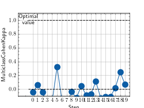 >>> from torch import randn, randint >>> # Example plotting a multiple values >>> from torchmetrics.classification import MulticlassCohenKappa >>> metric = MulticlassCohenKappa(num_classes=3) >>> values = [] >>> for _ in range(20): ... values.append(metric(randn(20,3).softmax(dim=-1), randint(3, (20,)))) >>> fig_, ax_ = metric.plot(values)