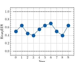 \[\text{EER} = \frac{\text{FAR} + (1 - \text{FRR})}{2}, \text{where} \min_t abs(FAR_t-FRR_t)\]The Equal Error Rate (EER) is the point where the False Positive Rate (FPR) and True Positive Rate (TPR) are equal, or in practise minimized. A lower EER value signifies higher system accuracy.