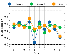 >>> # Example plotting multiple values >>> import torch >>> from torchmetrics.classification import MulticlassEER >>> metric = MulticlassEER(num_classes=3) >>> values = [ ] >>> for _ in range(10): ... values.append(metric(torch.randn(20, 3), torch.randint(3, (20,)))) >>> fig_, ax_ = metric.plot(values)