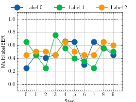>>> # Example plotting multiple values >>> import torch >>> from torchmetrics.classification import MultilabelEER >>> metric = MultilabelEER(num_labels=3) >>> values = [ ] >>> for _ in range(10): ... values.append(metric(torch.rand(20,3), torch.randint(2, (20,3)))) >>> fig_, ax_ = metric.plot(values)