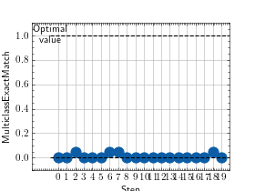 >>> # Example plotting multiple values >>> from torch import rand, randint >>> from torchmetrics.classification import MultilabelExactMatch >>> metric = MultilabelExactMatch(num_labels=3) >>> values = [ ] >>> for _ in range(10): ... values.append(metric(randint(2, (20, 3, 5)), randint(2, (20, 3, 5)))) >>> fig_, ax_ = metric.plot(values)