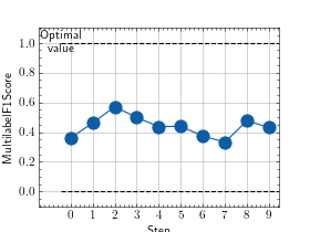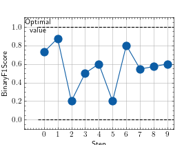 >>> from torch import rand, randint >>> # Example plotting multiple values >>> from torchmetrics.classification import BinaryF1Score >>> metric = BinaryF1Score() >>> values = [ ] >>> for _ in range(10): ... values.append(metric(rand(10), randint(2,(10,)))) >>> fig_, ax_ = metric.plot(values)