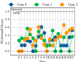 >>> from torch import rand, randint >>> # Example plotting multiple values >>> from torchmetrics.classification import MultilabelF1Score >>> metric = MultilabelF1Score(num_labels=3) >>> values = [ ] >>> for _ in range(10): ... values.append(metric(randint(2, (20, 3)), randint(2, (20, 3)))) >>> fig_, ax_ = metric.plot(values)