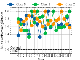 >>> # Example plotting multiple values >>> from torch import rand, randint >>> from torchmetrics.classification import MultilabelHammingDistance >>> metric = MultilabelHammingDistance(num_labels=3) >>> values = [ ] >>> for _ in range(10): ... values.append(metric(randint(2, (20, 3)), randint(2, (20, 3)))) >>> fig_, ax_ = metric.plot(values)