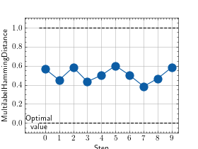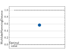 \[\text{Hamming distance} = \frac{1}{N \cdot L} \sum_i^N \sum_l^L 1(y_{il} \neq \hat{y}_{il})\]Where \(y\) is a tensor of target values, \(\hat{y}\) is a tensor of predictions, and \(\bullet_{il}\) refers to the \(l\)-th label of the \(i\)-th sample of that tensor.