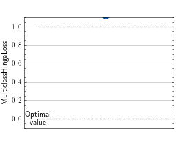 \[\text{Hinge loss} = \max\left(0, 1 - \hat{y}_y + \max_{i \ne y} (\hat{y}_i)\right)\]Where \(y \in {0, ..., \mathrm{C}}\) is the target class (where \(\mathrm{C}\) is the number of classes), and \(\hat{y} \in \mathbb{R}^\mathrm{C}\) is the predicted output per class. Alternatively, the metric can also be computed in one-vs-all approach, where each class is valued against all other classes in a binary fashion.