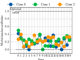 >>> # Example plotting a multiple values per class >>> from torch import randint >>> from torchmetrics.classification import MulticlassJaccardIndex >>> metric = MulticlassJaccardIndex(num_classes=3, average=None) >>> values = [] >>> for _ in range(20): ... values.append(metric(randint(3, (20,)), randint(3, (20,)))) >>> fig_, ax_ = metric.plot(values)