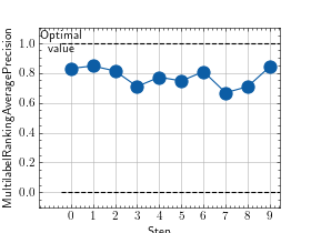 >>> from torch import rand, randint >>> # Example plotting multiple values >>> from torchmetrics.classification import MultilabelRankingAveragePrecision >>> metric = MultilabelRankingAveragePrecision(num_labels=3) >>> values = [ ] >>> for _ in range(10): ... values.append(metric(rand(20, 3), randint(2, (20, 3)))) >>> fig_, ax_ = metric.plot(values)