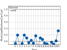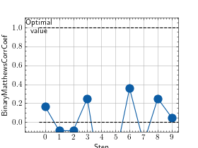 >>> from torch import rand, randint >>> # Example plotting multiple values >>> from torchmetrics.classification import BinaryMatthewsCorrCoef >>> metric = BinaryMatthewsCorrCoef() >>> values = [ ] >>> for _ in range(10): ... values.append(metric(rand(10), randint(2,(10,)))) >>> fig_, ax_ = metric.plot(values)