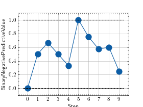 >>> from torch import rand, randint >>> # Example plotting multiple values >>> from torchmetrics.classification import BinaryNegativePredictiveValue >>> metric = BinaryNegativePredictiveValue() >>> values = [ ] >>> for _ in range(10): ... values.append(metric(rand(10), randint(2,(10,)))) >>> fig_, ax_ = metric.plot(values)