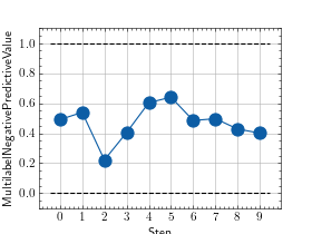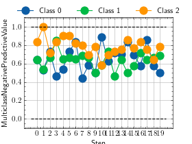 >>> from torch import rand, randint >>> # Example plotting multiple values >>> from torchmetrics.classification import MultilabelNegativePredictiveValue >>> metric = MultilabelNegativePredictiveValue(num_labels=3) >>> values = [ ] >>> for _ in range(10): ... values.append(metric(randint(2, (20, 3)), randint(2, (20, 3)))) >>> fig_, ax_ = metric.plot(values)