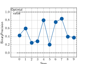 >>> from torch import rand, randint >>> # Example plotting multiple values >>> from torchmetrics.classification import BinaryPrecision >>> metric = BinaryPrecision() >>> values = [ ] >>> for _ in range(10): ... values.append(metric(rand(10), randint(2,(10,)))) >>> fig_, ax_ = metric.plot(values)