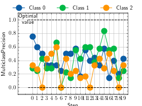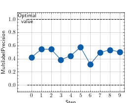 >>> from torch import rand, randint >>> # Example plotting multiple values >>> from torchmetrics.classification import MultilabelPrecision >>> metric = MultilabelPrecision(num_labels=3) >>> values = [ ] >>> for _ in range(10): ... values.append(metric(randint(2, (20, 3)), randint(2, (20, 3)))) >>> fig_, ax_ = metric.plot(values)