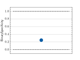 \[\text{Specificity} = \frac{\text{TN}}{\text{TN} + \text{FP}}\]Where \(\text{TN}\) and \(\text{FP}\) represent the number of true negatives and false positives respectively. The metric is only proper defined when \(\text{TN} + \text{FP} \neq 0\). If this case is encountered for any label, the metric for that label will be set to 0 and the overall metric may therefore be affected in turn.