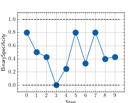 >>> from torch import rand, randint >>> # Example plotting multiple values >>> from torchmetrics.classification import BinarySpecificity >>> metric = BinarySpecificity() >>> values = [ ] >>> for _ in range(10): ... values.append(metric(rand(10), randint(2,(10,)))) >>> fig_, ax_ = metric.plot(values)