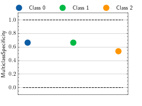 >>> from torch import randint >>> # Example plotting a single value per class >>> from torchmetrics.classification import MulticlassSpecificity >>> metric = MulticlassSpecificity(num_classes=3, average=None) >>> metric.update(randint(3, (20,)), randint(3, (20,))) >>> fig_, ax_ = metric.plot()
