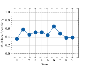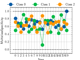 >>> from torch import rand, randint >>> # Example plotting multiple values >>> from torchmetrics.classification import MultilabelSpecificity >>> metric = MultilabelSpecificity(num_labels=3) >>> values = [ ] >>> for _ in range(10): ... values.append(metric(randint(2, (20, 3)), randint(2, (20, 3)))) >>> fig_, ax_ = metric.plot(values)