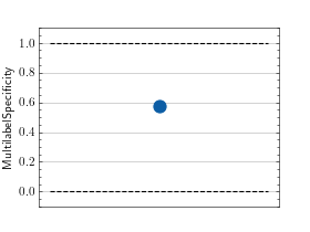 >>> from torch import tensor >>> from torchmetrics.classification import MultilabelSpecificity >>> target = tensor([[0, 1, 0], [1, 0, 1]]) >>> preds = tensor([[0, 0, 1], [1, 0, 1]]) >>> metric = MultilabelSpecificity(num_labels=3) >>> metric(preds, target) tensor(0.6667) >>> mls = MultilabelSpecificity(num_labels=3, average=None) >>> mls(preds, target) tensor([1., 1., 0.])