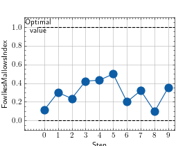>>> # Example plotting multiple values >>> import torch >>> from torchmetrics.clustering import FowlkesMallowsIndex >>> metric = FowlkesMallowsIndex() >>> values = [ ] >>> for _ in range(10): ... values.append(metric(torch.randint(0, 4, (10,)), torch.randint(0, 4, (10,)))) >>> fig_, ax_ = metric.plot(values)