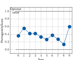 >>> # Example plotting multiple values >>> import torch >>> from torchmetrics.clustering import HomogeneityScore >>> metric = HomogeneityScore() >>> values = [ ] >>> for _ in range(10): ... values.append(metric(torch.randint(0, 4, (10,)), torch.randint(0, 4, (10,)))) >>> fig_, ax_ = metric.plot(values)
